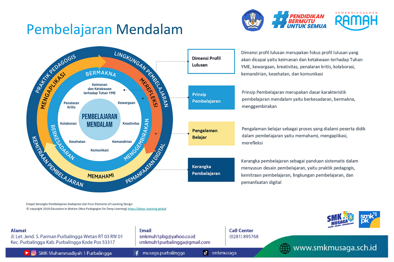 - Menyelaraskan Visi, Misi, dan Tujuan dengan Pembelajaran Mendalam harus berpedoman pada Kerangka Pembelajaran Mendalam sebagai panduan sistematis untuk menciptakan ekosistem pendidikan yang mendukung pembelajaran. Fokus utama kerangka ini adalah mendorong pembelajaran yang bermakna, reflektif, dan kontekstual melalui praktik, lingkungan, dan kemitraan yang terencana.