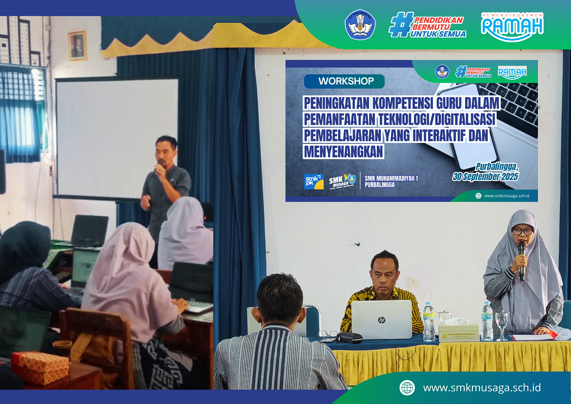 Beranda | WartaMusaga – Dalam implementasi Pembelajaran Mendalam, teknologi digital dapat dimanfaatkan dalam perencanaan, pelaksanaan, dan asesmen pembelajaran. Melalui pemanfaatan digital peserta didik akan mendapatkan pengalaman belajar yang lebih interaktif, fleksibel, dan kolaboratif. Mendasari hal tersebut, SMK Muhammadiyah 1 Purbalingga menggelar Workshop Peningkatan Kompetensi Guru dalam Pemanfaatan Teknologi (Digitalisasi Pembelajaran yang Interaktif dan Menyenangkan) pada hari Selasa, 30 September 2025 di aula SMK Muhammadiyah 1 Purbalingga. Kegiatan ini merupakan On The Job Training dari Pelatihan Pembelajaran Mendalam Bagi Kepala Sekolah SMK Purbalingga yang diselenggarakan oleh Balai Besar Pengembangan Penjaminan Mutu Pendidikan Vokasi (BBPPMPV) Seni dan Budaya. Sasarannya adalah untuk semua guru SMK Muhammadiyah 1 Purbalingga agar dapat mengimplementasikan kerangka Pembelajaran Mendalam khususnya dalam pemanfaatan digital untuk merencanakan pembelajaran, melaksanakan pembelajaran, dan melakukan asesmen pembelajaran.