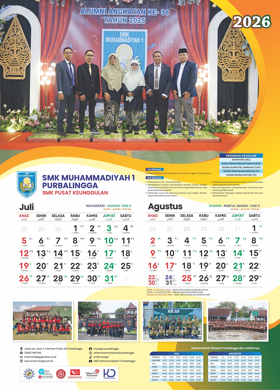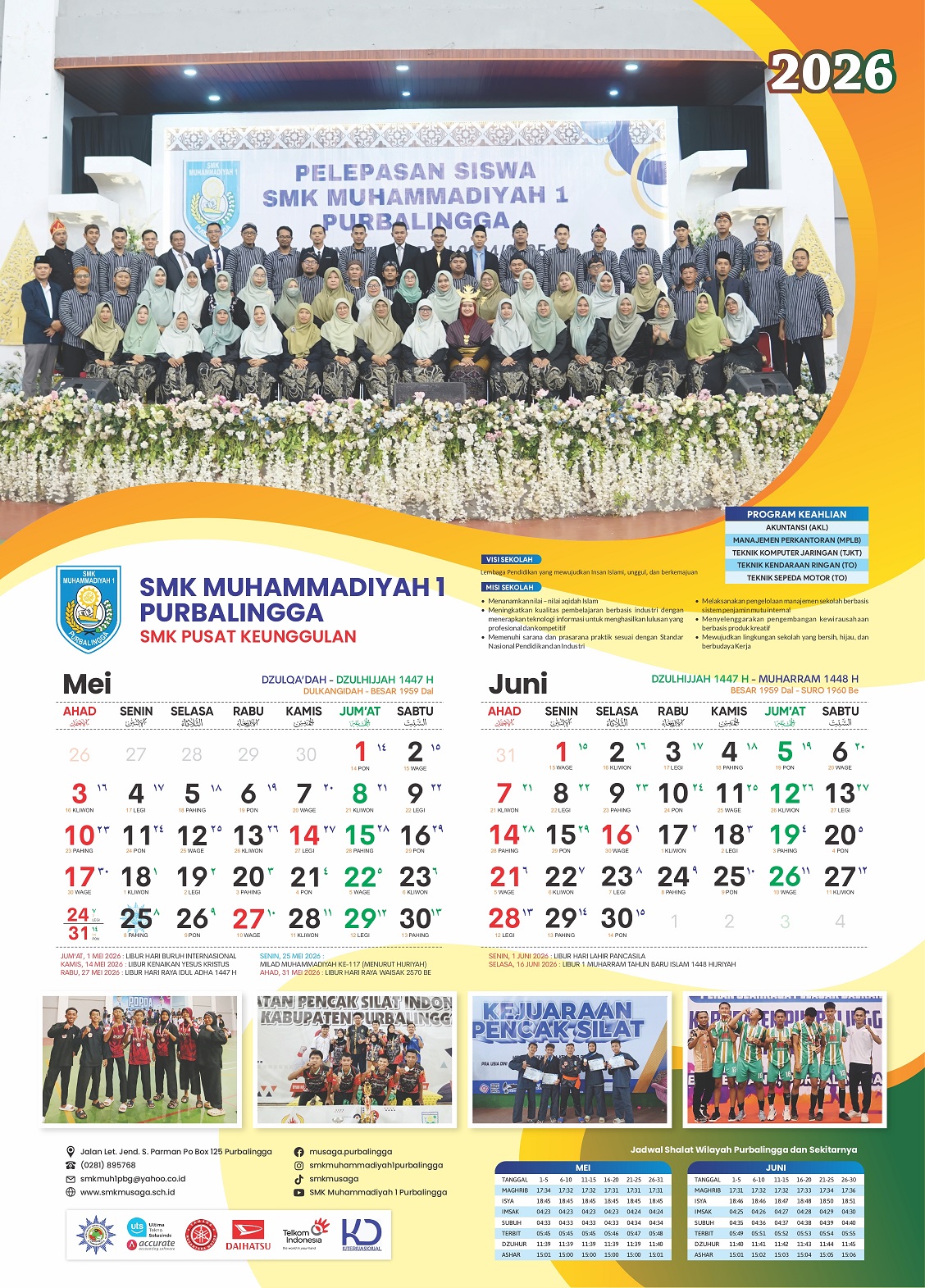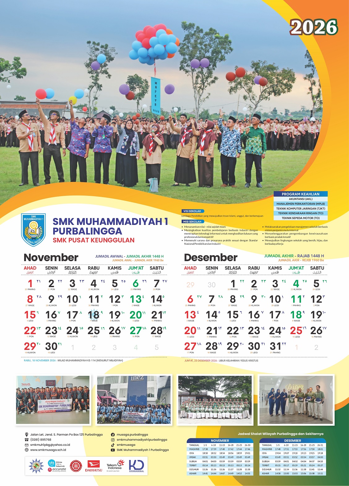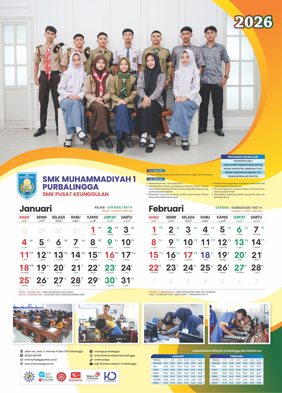 Beranda | WartaMusaga - SMK Musaga resmi menerbitkan Kalender Tahun 2026 yang hadir dengan desain informatif serta dilengkapi Penanggalan Kalender Hijriah Global Tunggal 1447 H / 1448 H, serta Hari Libur Nasional dan Cuti Bersama Indonesia Tahun 2026. Kalender SMK Muhammadiyah 1 Purbalingga ini dirancang sebagai rujukan utama bagi seluruh warga sekolah dan orang tua dalam mengatur ritme kegiatan sepanjang tahun.