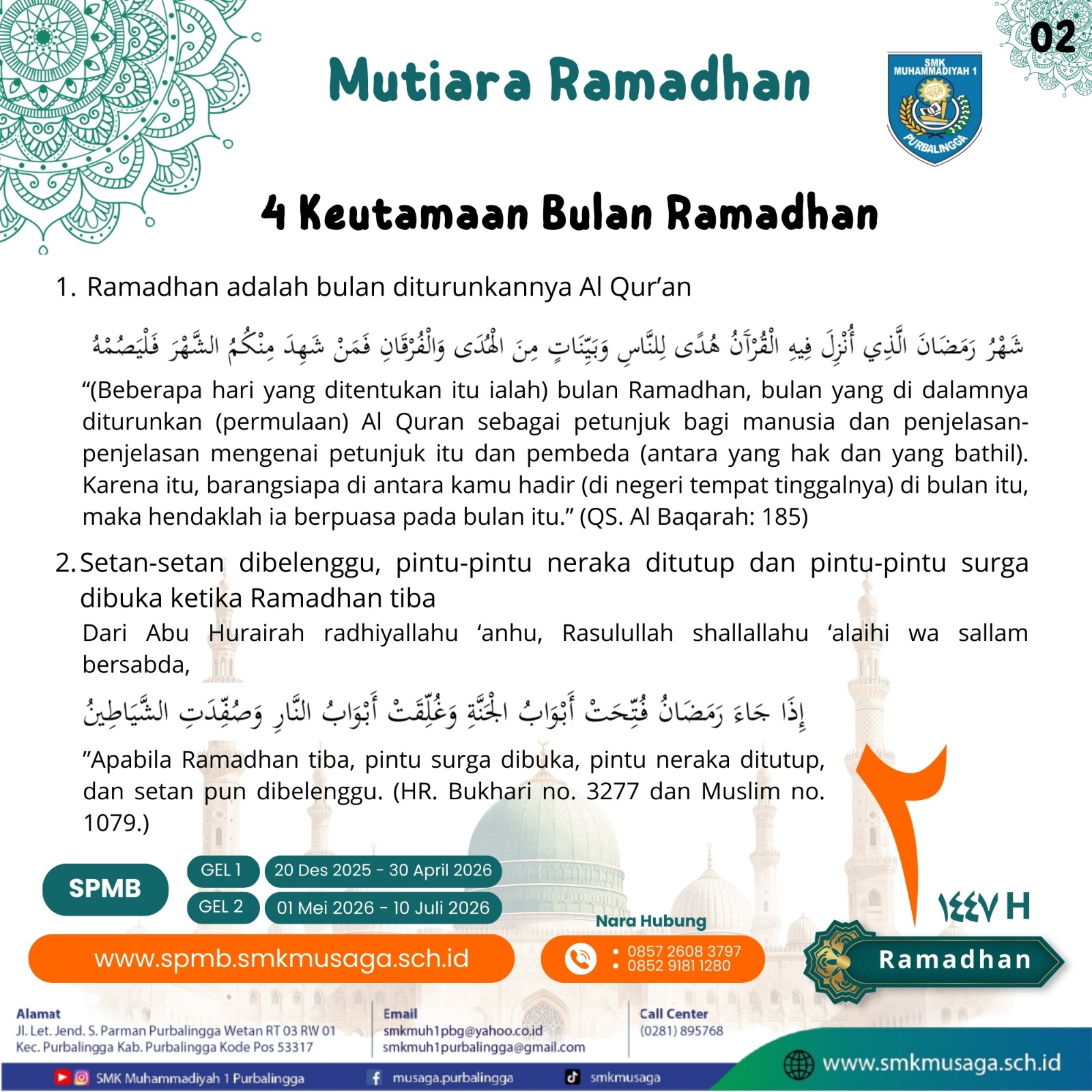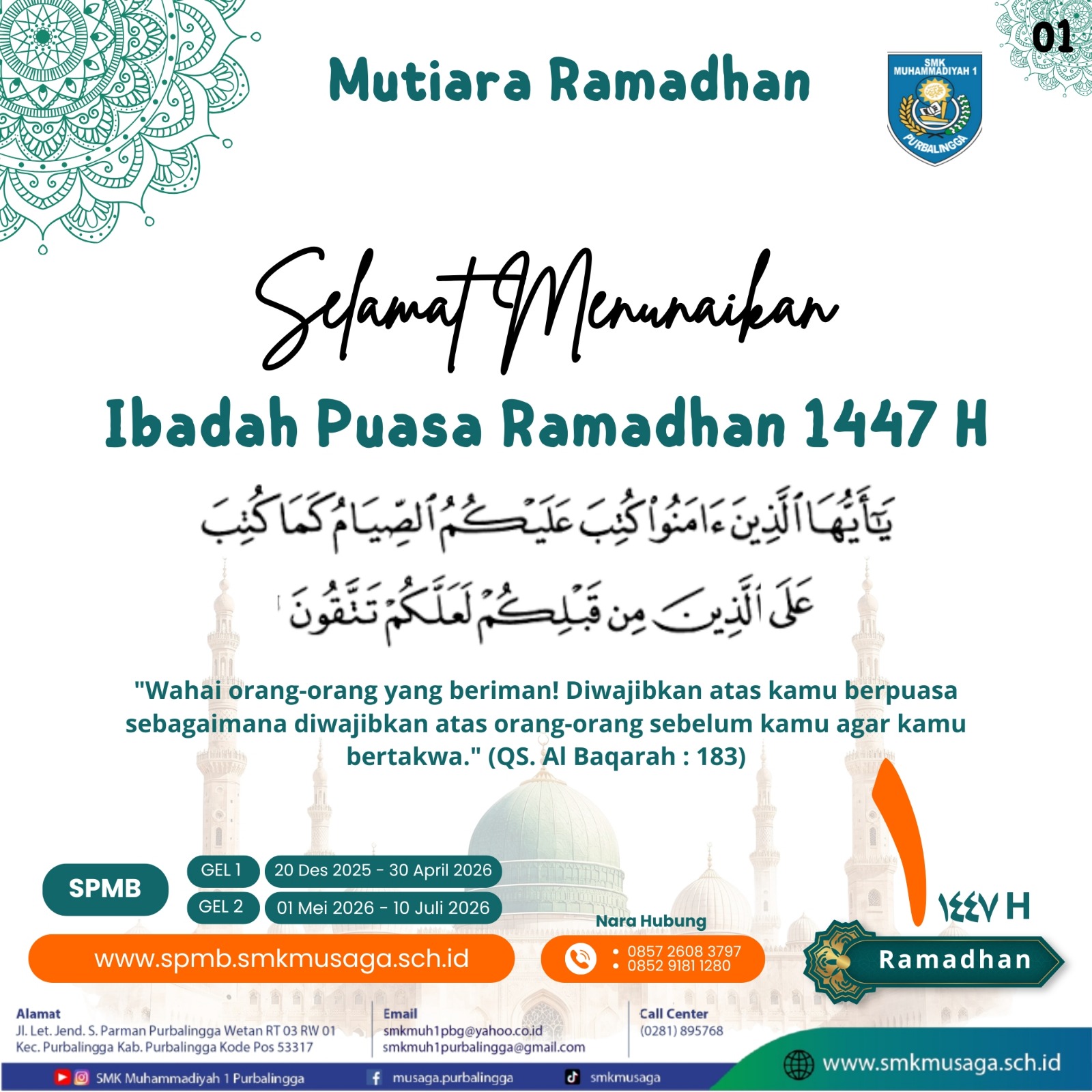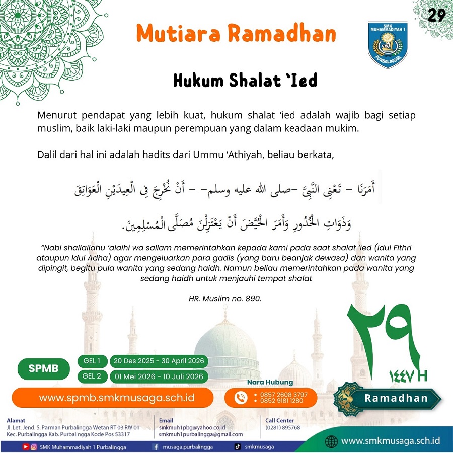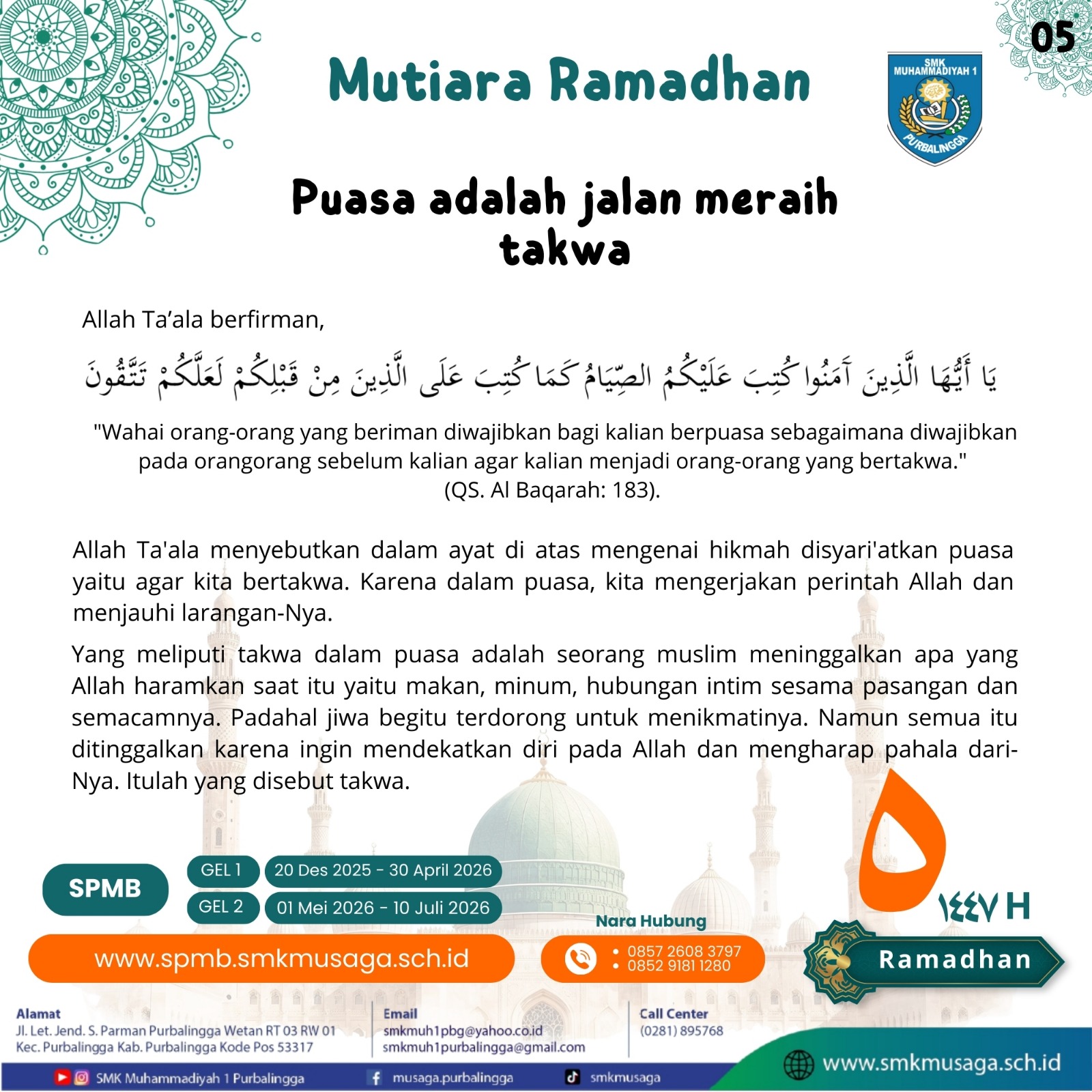 Beranda | WartaMusaga - Ramadhan 1447 H kembali menyapa kita dengan penuh keberkahan. Bulan suci ini bukan sekadar momentum menahan lapar dan dahaga, tetapi juga waktu terbaik untuk memperkuat iman, memperbaiki diri, dan meningkatkan kualitas ibadah. Melalui program Mutiara Ramadhan 1447 H, Biro Publikasi SMK Muhammadiyah 1 Purbalingga menghadirkan pesan-pesan inspiratif setiap hari selama bulan Ramadhan. Konten ini bertujuan untuk menumbuhkan semangat beribadah, memperdalam nilai-nilai keislaman, serta membangun karakter religius di lingkungan sekolah. Sebagai keluarga besar SMK Muhammadiyah 1 Purbalingga, mari kita jadikan Ramadhan tahun ini sebagai momentum perubahan menuju pribadi yang lebih baik. Perbanyak tadarus Al-Qur’an, tingkatkan kualitas shalat, hidupkan semangat berbagi, dan jaga akhlak baik di sekolah maupun di masyarakat.