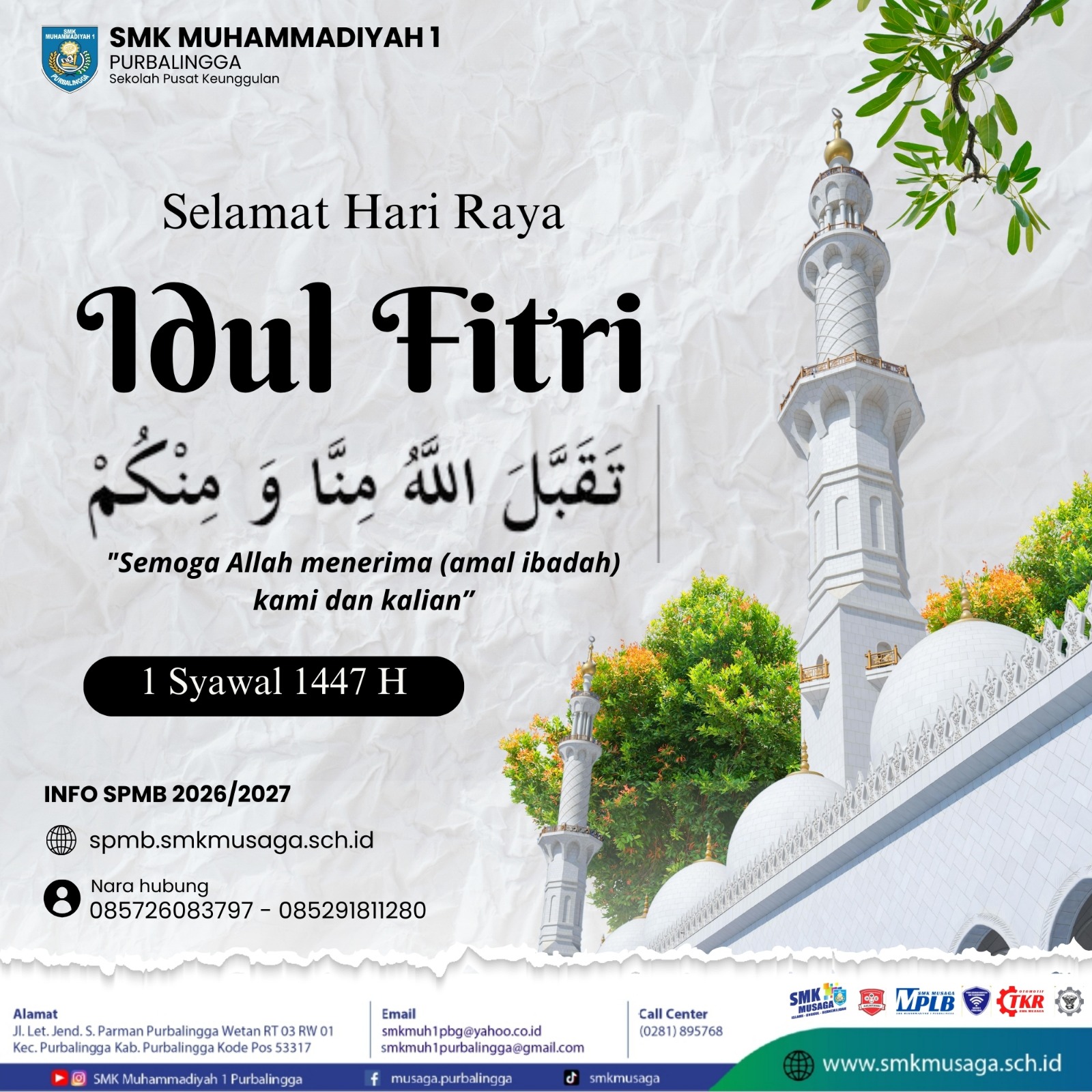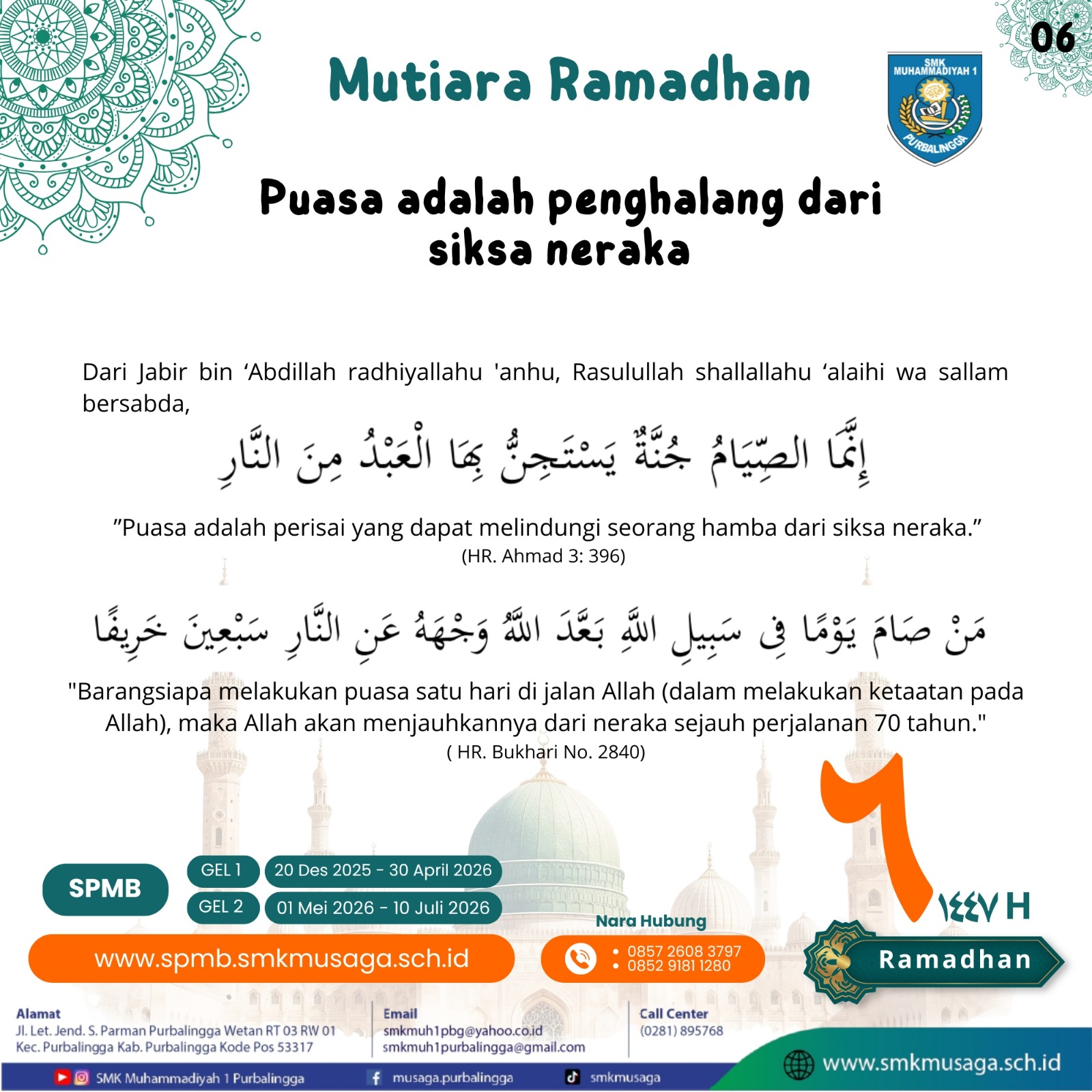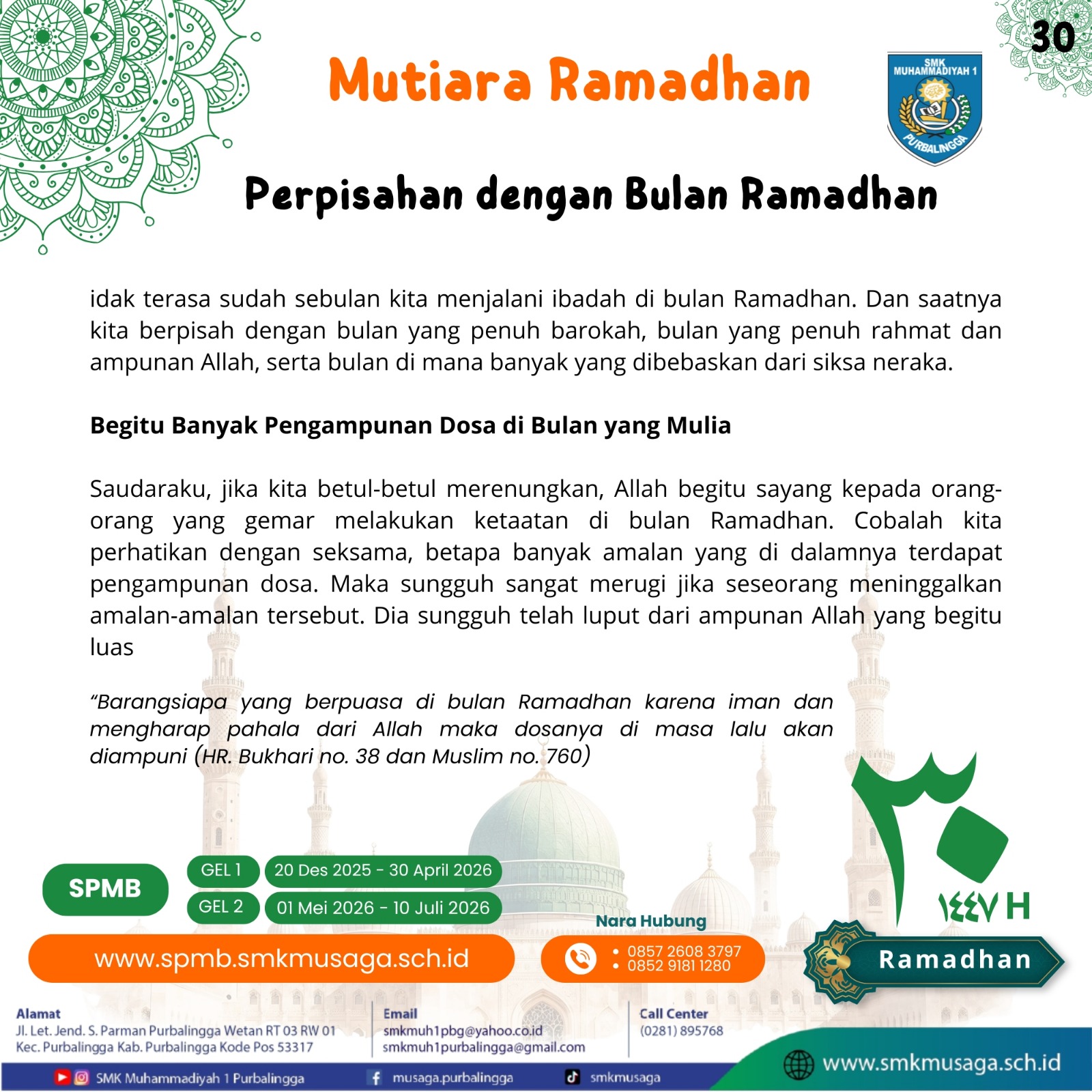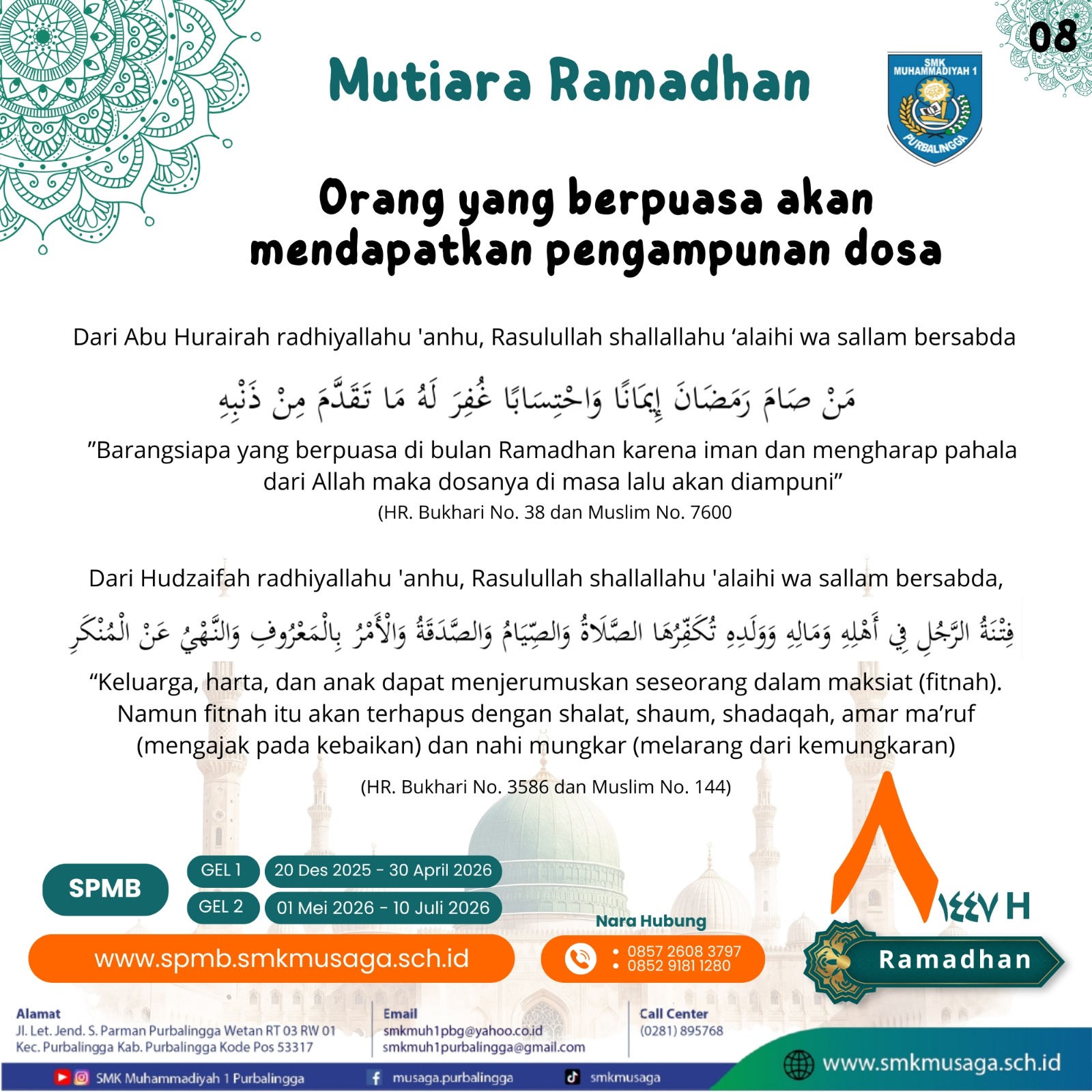 Beranda | WartaMusaga - Ramadhan 1447 H kembali menyapa kita dengan penuh keberkahan. Bulan suci ini bukan sekadar momentum menahan lapar dan dahaga, tetapi juga waktu terbaik untuk memperkuat iman, memperbaiki diri, dan meningkatkan kualitas ibadah. Melalui program Mutiara Ramadhan 1447 H, Biro Publikasi SMK Muhammadiyah 1 Purbalingga menghadirkan pesan-pesan inspiratif setiap hari selama bulan Ramadhan. Konten ini bertujuan untuk menumbuhkan semangat beribadah, memperdalam nilai-nilai keislaman, serta membangun karakter religius di lingkungan sekolah. Sebagai keluarga besar SMK Muhammadiyah 1 Purbalingga, mari kita jadikan Ramadhan tahun ini sebagai momentum perubahan menuju pribadi yang lebih baik. Perbanyak tadarus Al-Qur’an, tingkatkan kualitas shalat, hidupkan semangat berbagi, dan jaga akhlak baik di sekolah maupun di masyarakat.